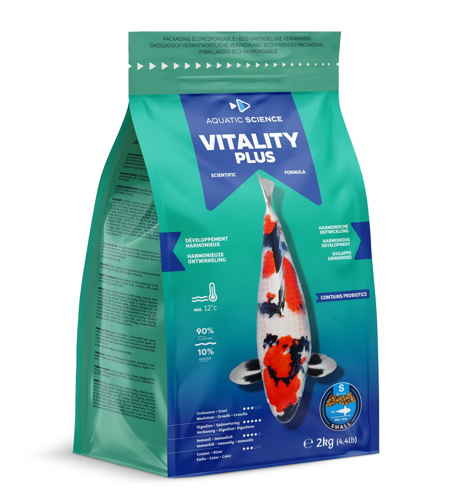 Vitality Plus est l'aliment optimal utilisé par les éleveurs de Koïs. Ils apprécient ses performances tant sur la croissance et les couleurs que sur la vigueur et la résistance des poissons. Il est idéal pour établir une ration d'entretien dès que la température de leau dépasse 12°C.