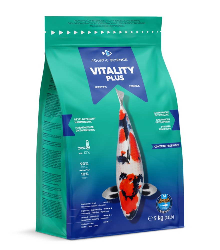 Avec son calibre de 4-5 mm ce format est adapté à toute les tailles de carpes Koï et autre poissons d'ornement. La présence de probiotiques dans le Vitality Plus, renforce l'immunité du poisson et augmente la digestion ce qui diminue les déchets dans le bassin