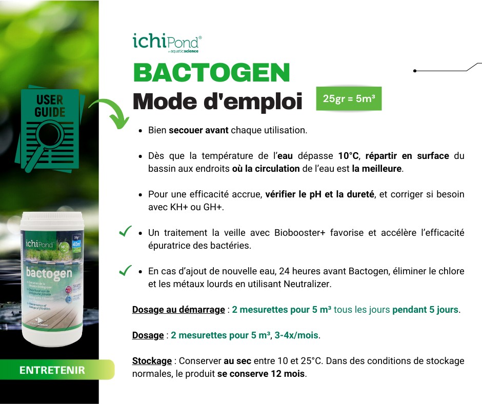 BACTO-GEN est indiqué pour le traitement des eaux vertes, l'élimination progressive des vases, la mise en route ou l'amélioration de la filtration (élimination des nitrites et de l'ammoniac), ...