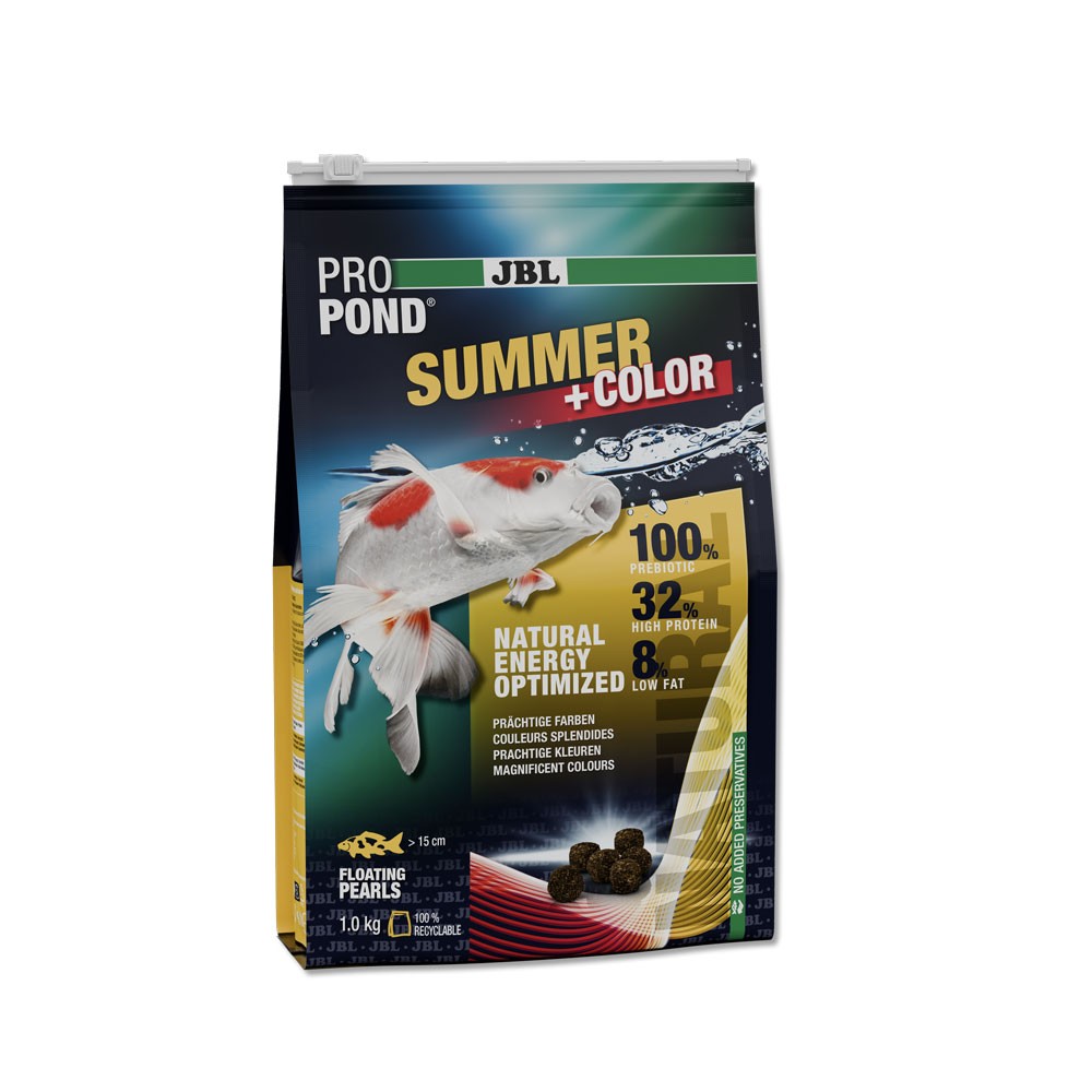 JBL ProPond Summer est un aliment complet spécialement formulé pour la période estivale. Grâce à son rapport protéines/lipides de 4:1, il répond parfaitement aux besoins nutritionnels des koïs lorsque la température de l’eau est comprise entre 20 et 30 °C.