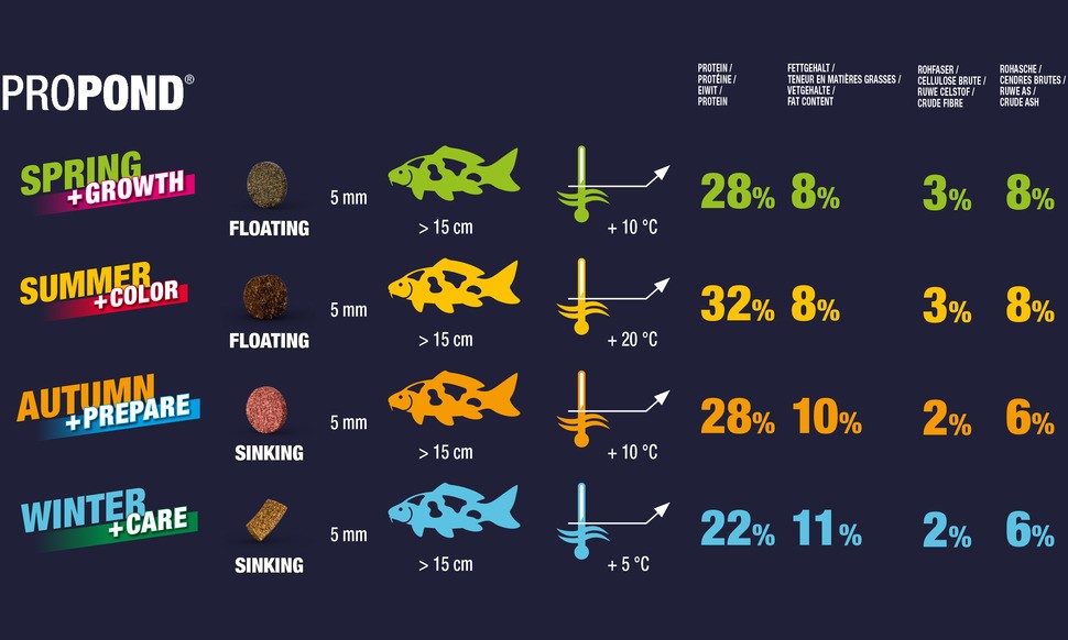 🔬 Formule NEO Index® 4:1 : Ratio protéines/lipides optimisé (4/1) selon la température de l’eau (20 à 30 °C), la taille, l’âge du poisson et la fonction de l’aliment (ici, alimentation saisonnière).