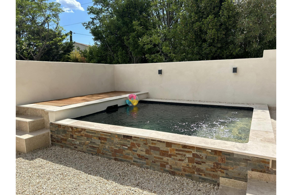 Ce bassin de baignade à été conçus avec un filtre se situant légèrement sous le niveau de l'eau. Cette installation est plus technique à réaliser mais beaucoup plus discrète. Cela permet d'obtenir un rendu très moderne.